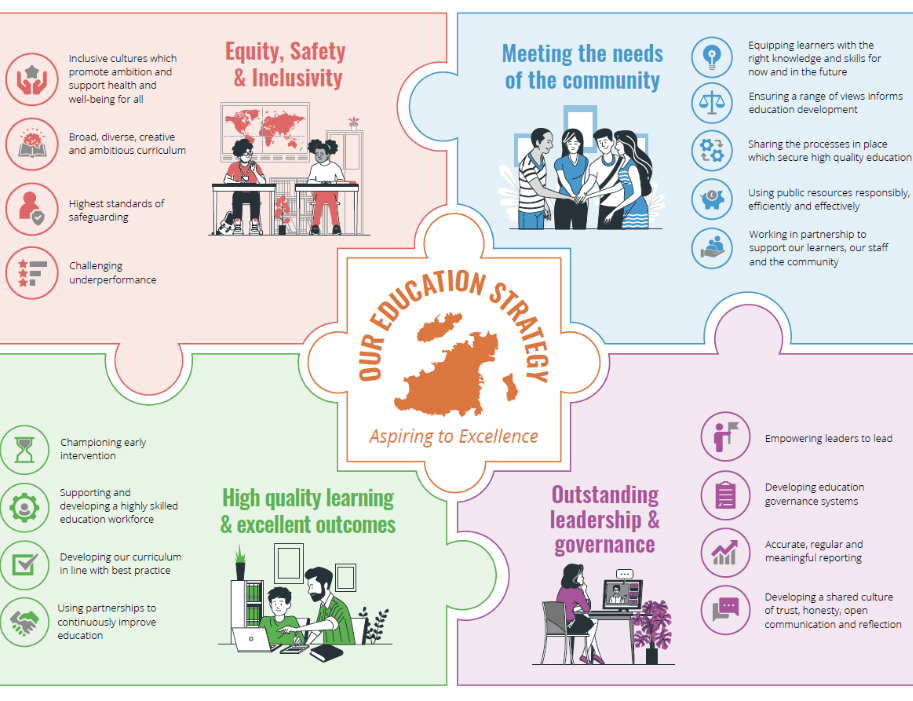It articulates the ambition and aspiration for the islands' learners through four overarching priorities and describes how these priorities will be realised through a series of more detailed commitments. This helps to ensure the best possible outcomes for all learners so that the education they receive makes a tangible difference to their lives and the community as a whole. Beyond our schools, our education strategy also covers community, professional and business to business learning.