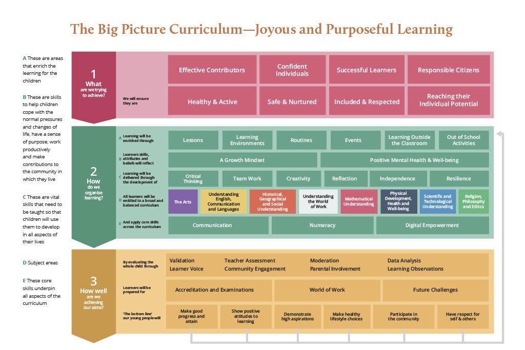 Our curriculum is developed in conjunction with two supporting documents - The Bailiwick of Guernsey Big Picture Curriculum- (see overview below) and the Guernsey Subject Specific Entitlement Documents. Our Subject Leaders are currently striving to develop their subject curriculum's in order to meet our Core Aims. The Guernsey Big Picture Curriculum and therefore our school curriculum has four core purposes. These enable our learners to become: